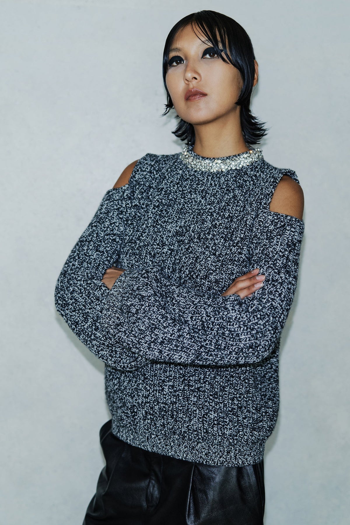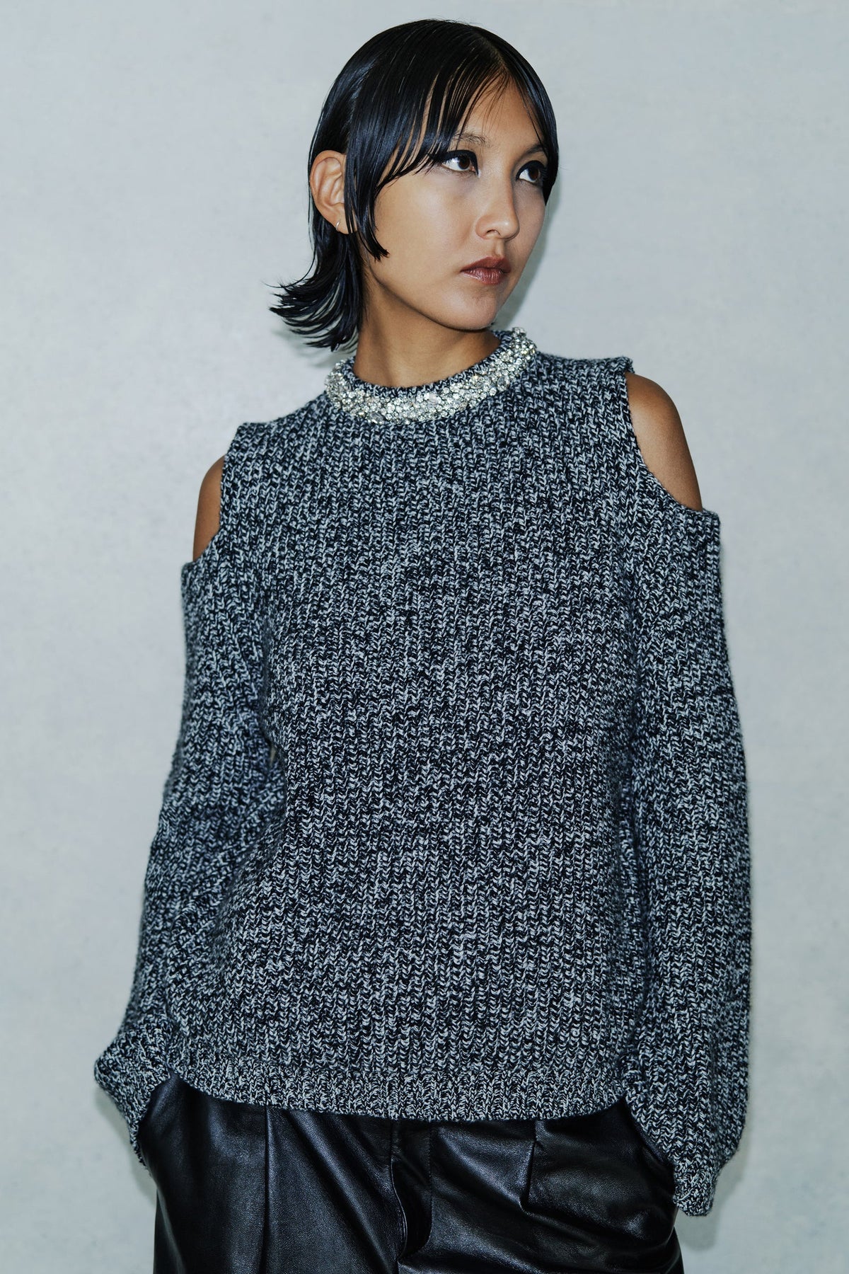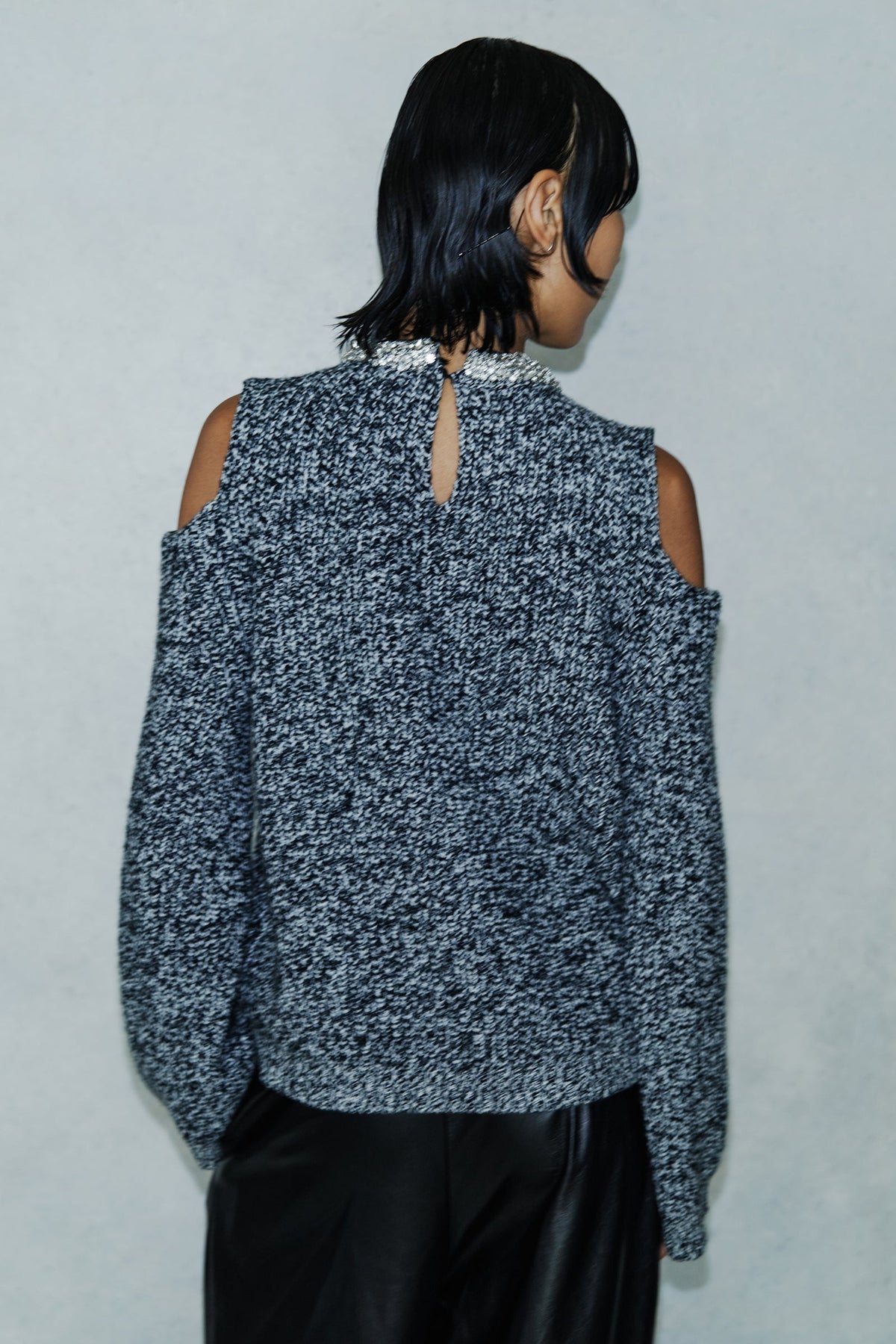 Pull ras du cou en cachemire mélangé, finition moulinée, découpes aux épaules, manches larges et évasées, détail strass au niveau du col, coupe confortable, longueur hanches.